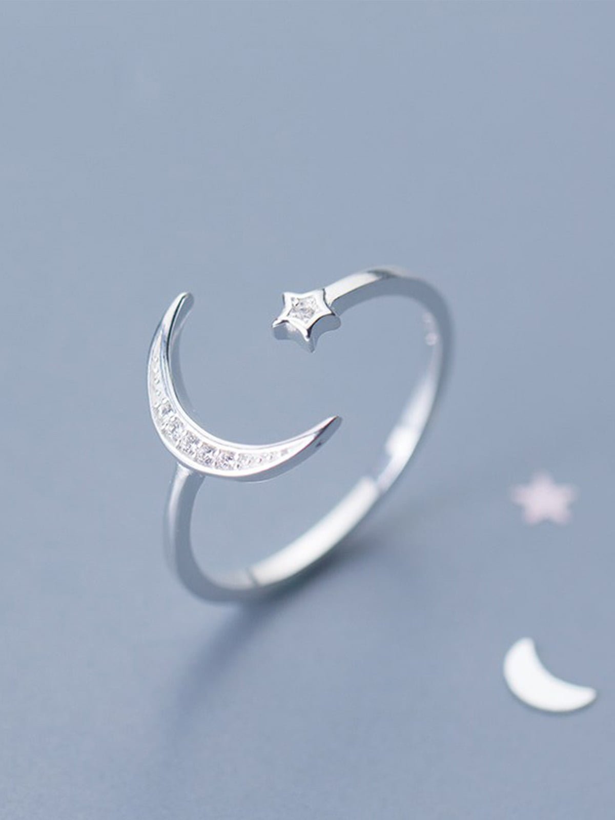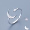 The Celestial Crescent Ring features a delicate crescent moon adorned with sparkling crystals and a tiny star accent, offering a beautiful, celestial-inspired design perfect for adding a touch of elegance to any look.