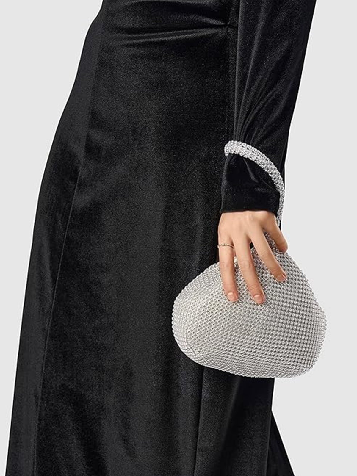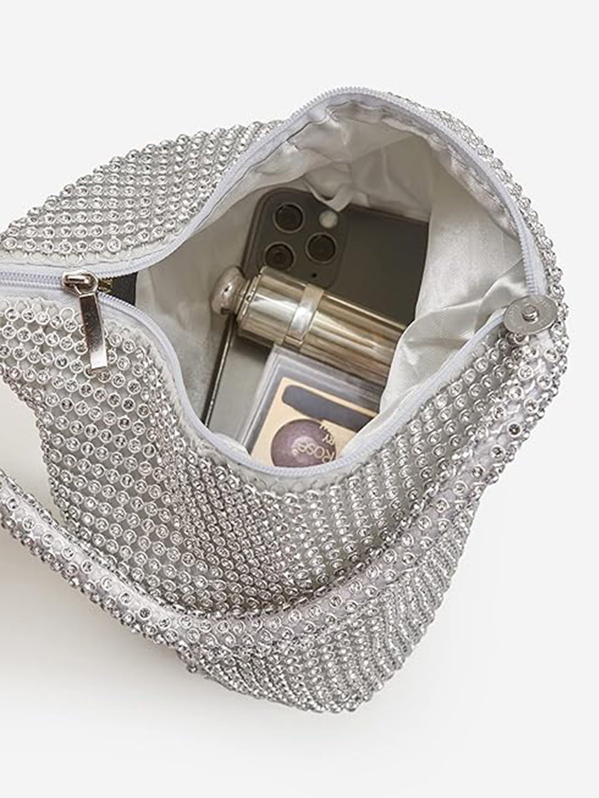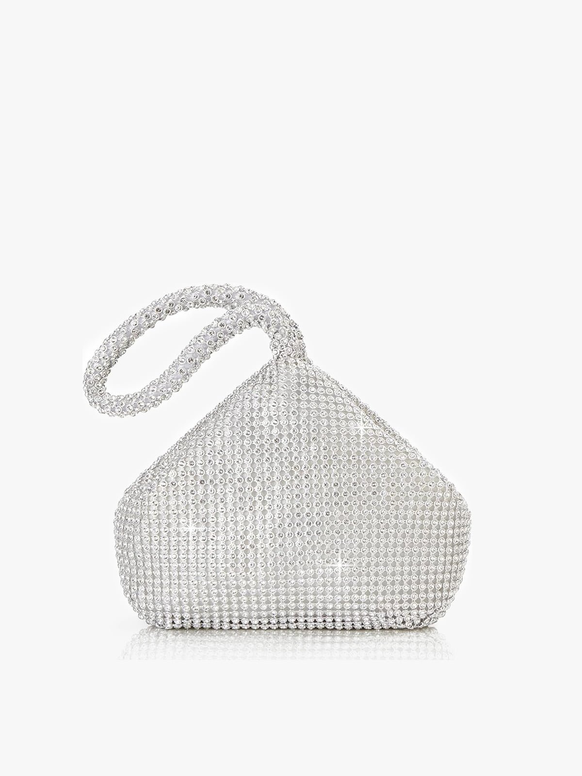 The Crystal Prism Pouch is a stunning rhinestone glitter evening bag, featuring a sleek geometric design adorned with shimmering rhinestones. Its spacious interior holds all your essentials, while the sparkling exterior adds a touch of glamour, making it perfect for special occasions.
