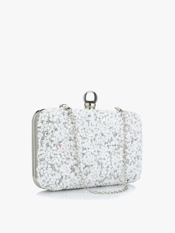 The “Pearl Moonlight” clutch melds elegance with function. Its pearlescent surface glows with a soft luster, complemented by a chic gold-tone chain and ring clasp. Perfect for adding a touch of glamour to any evening look, this clutch is both a stylish accessory and a practical choice for securing your essentials.